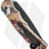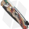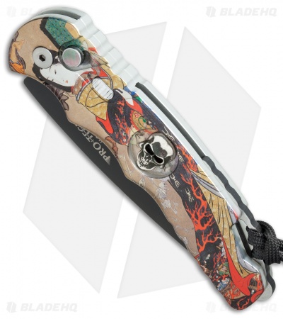 This Pro-Tech TR-4 knife features a Bruce Shaw designed sterling silver skull and polished, custom geisha splash anodized aluminum handle. The 154-CM stainless steel blade is black finished and the handle hardware is black coated with a two-tone glass breaker.