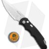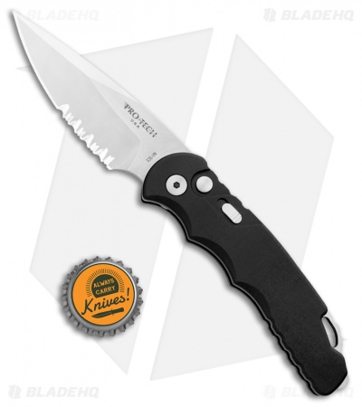 This TR-5 automatic model has a black anodized aluminum handle with a two-tone black back spacer/lanyard attachment, and a deep carry tip-up pocket clip. Its blade is partially serrated and made from CPM-S35VN stainless steel in a stonewash finish. A sliding safety lock allows secure pocket carry and prevents accidental blade deployment.