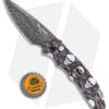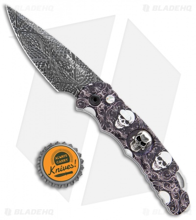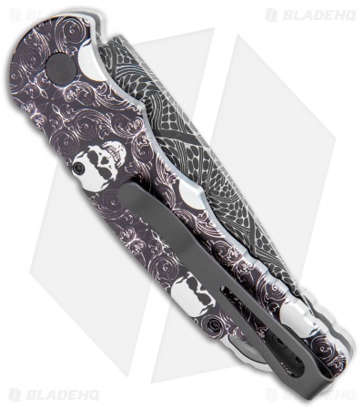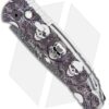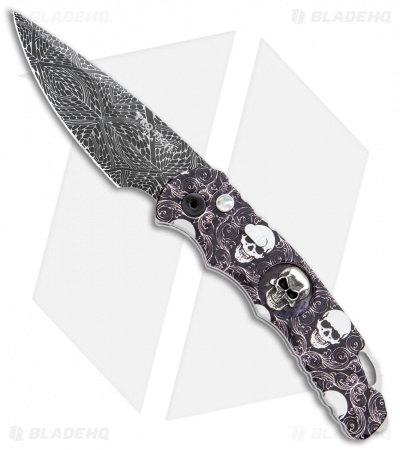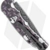This TR-5 automatic model has a custom “Skull Fluer De Lis” anodized aluminum handle with a Bruce Shaw designed sterling skull inlay, mother of pearl push button, and a deep carry tip-up pocket clip. Its blade is made from CPM-S35VN stainless steel in a black DLC coated finish. A sliding safety lock allows secure pocket carry and prevents accidental blade deployment.