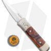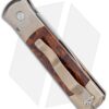 This Ultimate Custom Godson has a satin finished 154-CM steel blade with a plain edge. The handle is orange peel finished, bronze anodized 6al4v titanium with jew-grade desert ironwood inlays. A pin mosaic makes up the firing button. Item includes a tip-up pocket clip for easy carry. Includes a titanium pocket clip.