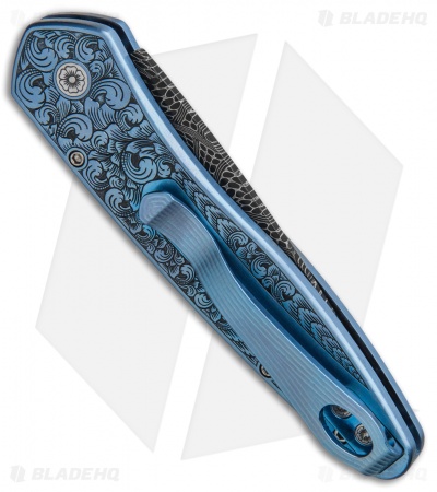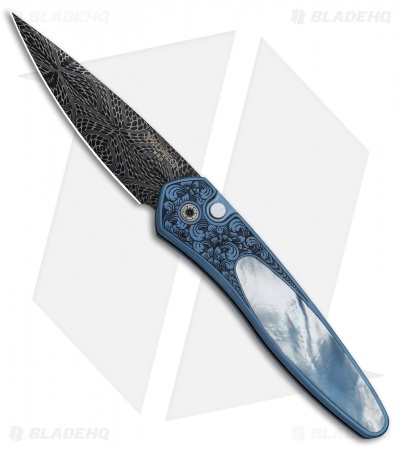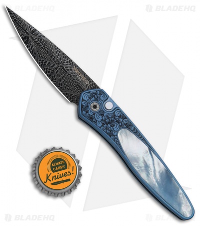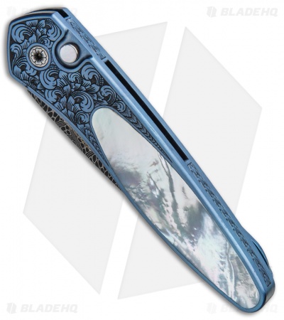 This Ultimate Custom Newport knife from Pro-Tech features a blue anodized titanium handle hand engraved by Bruce Shaw. An elegant gold lip pearl inlay and matching push button insert add a splash of natural beauty. The blade is Chad Nichols stainless “Mosaic” Damascus steel.