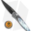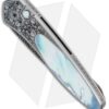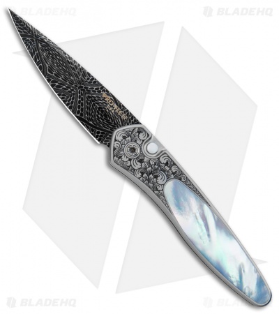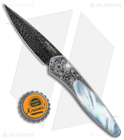 This Ultimate Custom Newport knife from Pro-Tech features a hand satin finished 416 stainless steel handle hand engraved by Bruce Shaw. An exquisite mother of pearl inlay and matching push button insert add a splash of natural beauty. The blade is Chad Nichols mosaic high carbon Damascus steel. It features a custom titanium pocket clip.