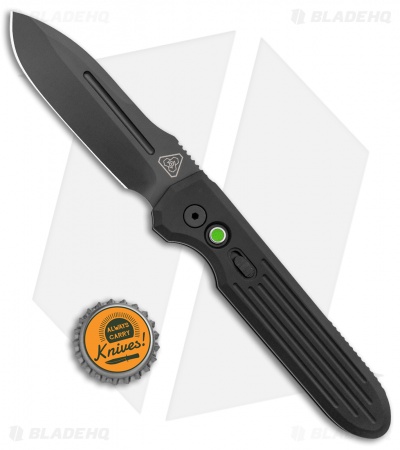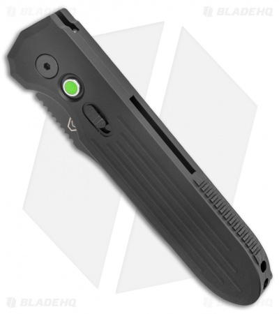 This Invictus model is outfitted with a black finished 154-CM blade and a black aluminum handle with a green G-10 firing button.
