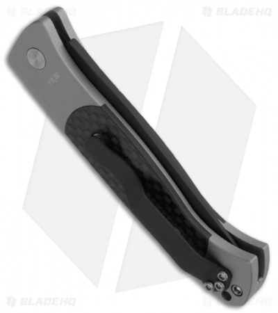 This Brend 2 automatic knife has a black DLC finished 154-CM steel blade and grey anodized T6 aluminum body with carbon fiber inlays, satin hardware and black pocket clip.