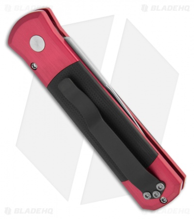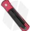 This Godson has a satin finished 154-CM steel blade with a plain edge. The handle is red anodized aluminum with black G-10 inlays. Black finished tip-up carry pocket clip and satin hardware.
