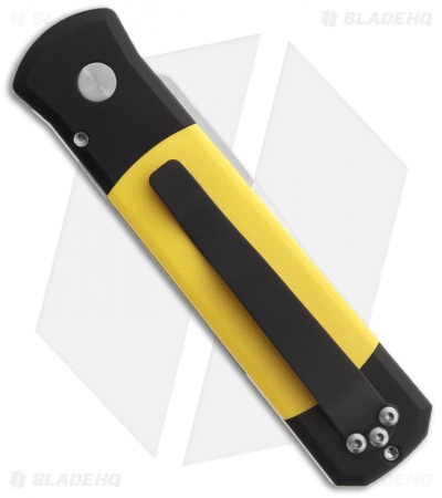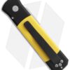 This Godson has a satin finished 154-CM steel blade with a plain edge. The handle is black anodized aluminum with yellow G-10 inlays. Black finished tip-up carry pocket clip and satin hardware.