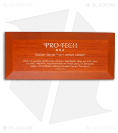This Godson Steam Punk Ultimate Custom Steel from Protech is the first of its kind and truly impressive. The Steam Punk is set up with deep relief hand engraved/carved solid brass inlays by Bruce Shaw! The handle is hand satin finished 416 stainless steel and the blade is Chad Nichols stainless “Ladder” pattern Damascus. The Steam Punk Ultimate Custom Godson comes with a wood display box (see picture above).