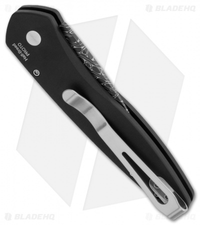 This Custom Half-Breed knife has a brilliant Chad Nichols high carbon mosaic Damascus blade and black anodized aluminum handle with presentation grade pearl inlay and matching push button insert. Satin hardware and a tip-up carry pocket clip.