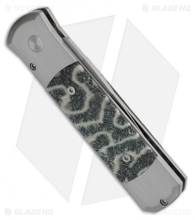 This Custom Steel Godson knife from Protech is a beautiful combination of materials and craftsmanship. It features a hand ground, mirror polished 154-CM steel blade with satin flats. The handle is 416 stainless steel and fitted with unique brain coral inlays. The mosaic pin push button deploys and releases the coil spring automatic.