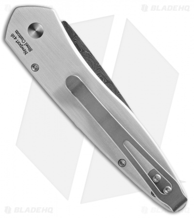 This custom Newport knife has a Chad Nichols stainless steel Damascus blade and hand satin finished 416 stainless steel handle with a Mastodon Tooth inlay. Mosaic pin push button, satin hardware and pocket clip.