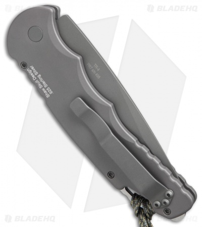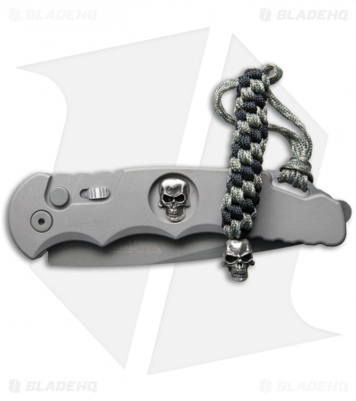 This Tactical Response TR-4 automatic knife features a Bruce Shaw designed sterling silver skull set into the gray anodized aluminum handle. The 154-CM stainless steel blade is bead blast finished and the hardware is bead blast finished with a two-tone glass breaker. Includes custom skull lanyard.