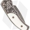 This Ultimate Custom Runt J4 is the best of the best! The hand satin finished 416 steel frame is fully hand engraved by Bruce Shaw. The inlays are mother of pearl with a matching push button and the blade is Rob Thomas stainless Damascus steel. The pictures above are of the actual knife for sale!