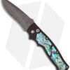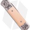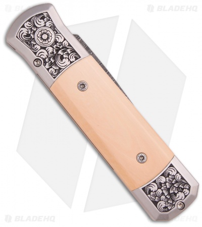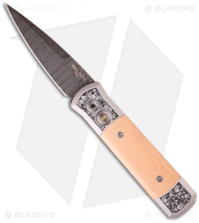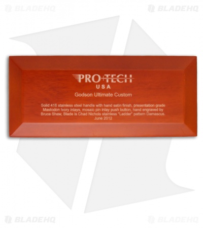 This Ultimate Custom Steel Godson from Protech is a splendid piece that has been tastefully customized! The handle is hand satin finished 416 stainless steel that has been hand engraved by Bruce Shaw. The inlays are Mastodon Ivory and the push button has a mosaic pin inlay. The blade is Chad Nichols “Ladder” pattern Damascus. This Ultimate Custom Godson includes a wood display box (see picture above).