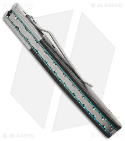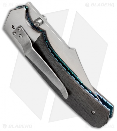 Making fine custom knives is in their blood, and this Freedom Fighter by Rainy and son Cory Vallotton is evidence of the claim. It’s a dual-action automatic with a hidden bolster release and thumb stud opener. The clip point style blade is hollow ground and satin finished. Polished carbon fiber scales and stainless steel bolsters sit atop the green anodized titanium liner lock frame. The liners and 440C stainless steel back spacer are hand filed. The Freedom Fighter is outfitted with a titanium pocket clip for tip-down carry. This knife is #2 in a run of 30 originals, marked on the blade and included with the certificate of authenticity.