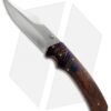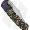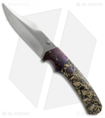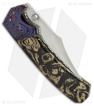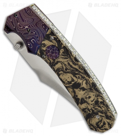Making fine custom knives is in their blood, and this Freedom Fighter by Rainy and son Cory Vallotton is evidence of the claim. It’s a dual-action automatic with a push button release and thumb stud opener. The clip point style blade is hollow ground and satin finished ATS-34 stainless steel. M3 Mokume scales and Chad Nichols “Fade” Damascus steel bolsters sit atop the gold anodized titanium liner lock frame. The liners and 440C stainless steel back spacer are hand filed.