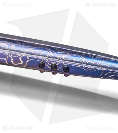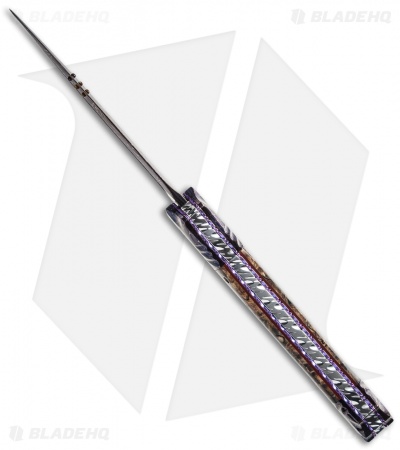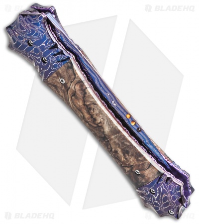 This Mace is a handmade automatic knife from Rainy Vallotton that features a stunning Chad Nichols “Zag” pattern Damascus steel dagger blade with tortoise shell tabs and deep fuller grooves on either side. The handle has Zag Damascus bolsters along with beautiful spalted box elder wood scales. Anodized titanium liners and polished stainless steel back spacer are filed and round out this beautiful knife.