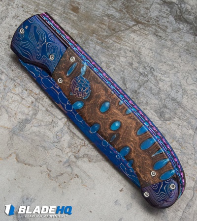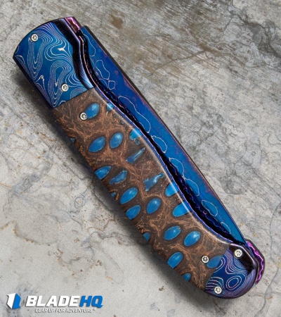 Rainy Vallotton Custom Titan Automatic Knife Blue Resin Burl (4″ Damascus)