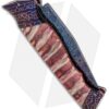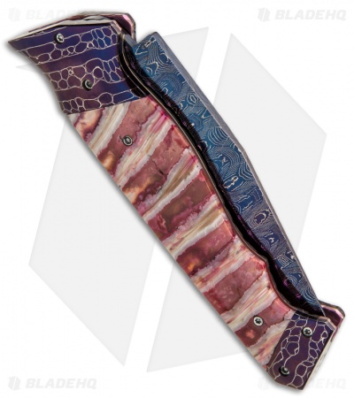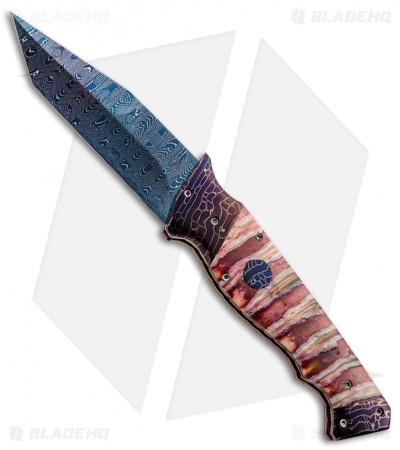 This Rainy Vallotton Custom Triad automatic knife is simply fantastic! The swedged tanto blade is Chad Nichols “Hiro-Heto” pattern Damascus steel. This knife features a blued Damascus bolstered handle with mammoth molar scales. Anodized titanium liners and polished 440C stainless steel back spacer. The knife features file work on the liners as well as the back spacer. All of Rainy Vallotton’s work is simply breathtaking and this Triad auto is no different.