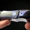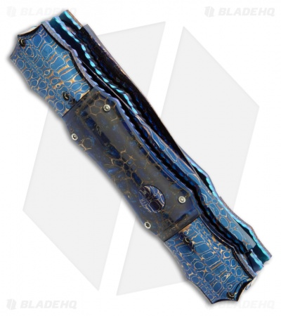 The Double-Ended Hell Razor from Rainy Vallotton is a fabulous knife that features two automatic opening blades with Chad Nichols “Cheetah” Damascus steel. The handle has Blue Sweet Gum Pod scales (made using sweetgum pods, set in a deep blue acrylic) with anodized titanium liners and a polished 440C stainless steel back spacer. The knife features file work on the liners as well as the backspacer. The bolsters are Chad Nichols “Cheetah” Damascus.