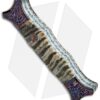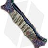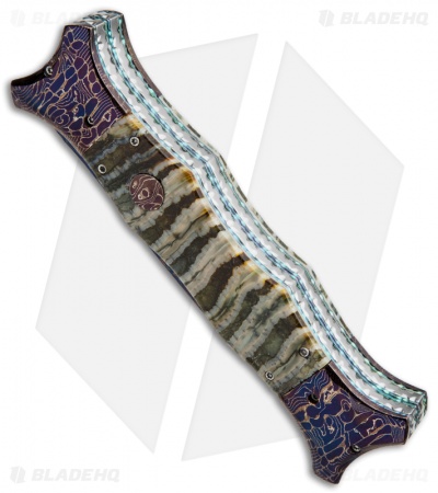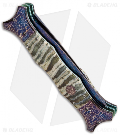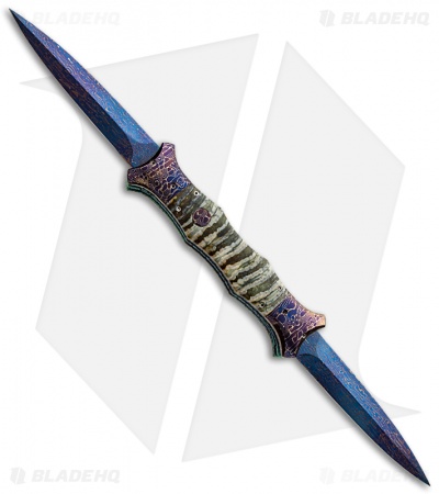 The Helios Double Ender knife from Rainy Vallotton is a fabulous knife that features two automatic opening blades with Chad Nichols “Whiplash” Damascus steel. The handle has Green Mammoth Molar scales with anodized titanium liners and polished 440C stainless steel back spacers. The knife features file work on the liners as well as the backspacer. The bolsters are Chad Nichols “Frenzy” Damascus.