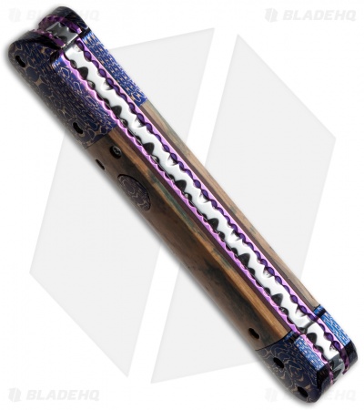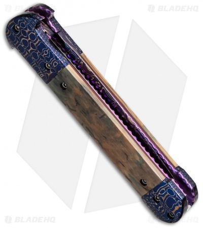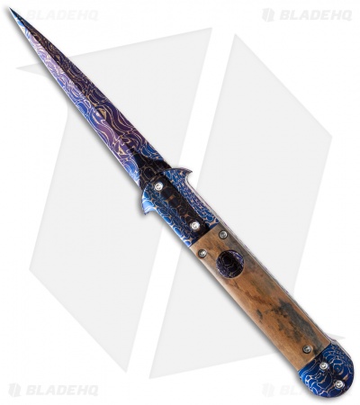 This custom Mini C-Lance from Rainy Vallotton is a gorgeous, diminutive automatic knife. It features a mammoth handle with Damascus bolsters and push button. The handle has anodized titanium liners and a polished 440C stainless steel back spacer. The knife features file work on the liners as well as the back spacer. This knife has a Chad Nichols “Cheetah” Damascus steel dagger style blade. Comes in a gift box with a certificate of authenticity. The pictures above are of the actual knife for sale.
