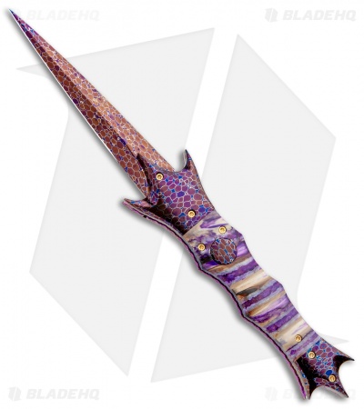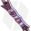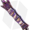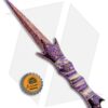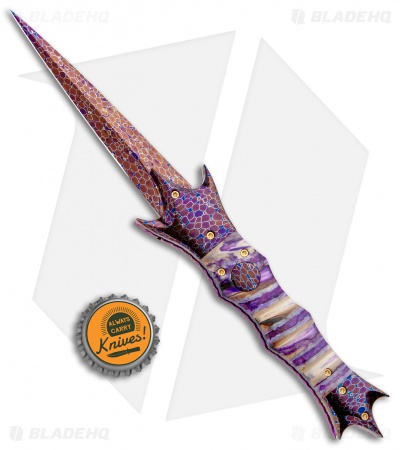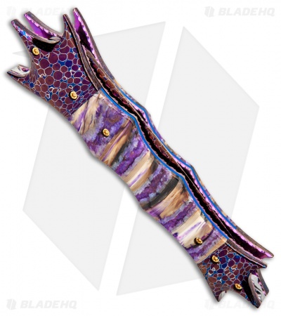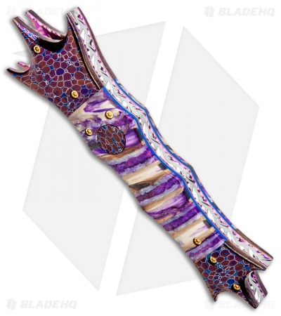 This Rainy Vallotton Custom Prototype Warlock’s Apprentice is a beautiful automatic knife. This knife features a Bertie Rietveld “Dragon Skin” Damascus steel blade and matching bolsters. The handle is purple colored mammoth molar with purple anodized titanium liners and a polished 440C stainless steel back spacer. The knife features file work on the liners as well as the back spacer.