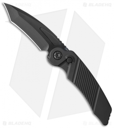 This MRX Lightweight model has a textured black aluminum handle and a tanto blade with a black finish.