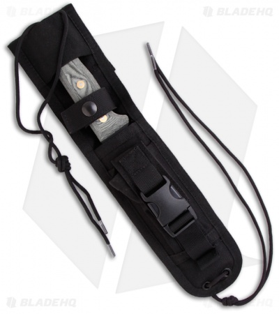 The 1075 High Carbon Steel blade with a black Fluoralon coating. The black Fluoralon coating makes the blade perfect for places that have salt air or may come in contact with salt water. It also prevents glare while in use with military personnel. The linen Micarta handle finishes off the knife. The knife is supplied with a high quality Cordura sheath.