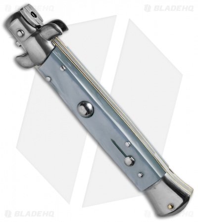 This 9″ Italian Stiletto from SKM Italy offers classic stiletto style with a light blue pearlex handle and a satin finished dagger blade. SKM makes a variety of Italian stilettos featuring traditional designs at an affordable price. This 9″ model has a pearlex handle with stainless steel bolsters. Brass pins and liners add a classic finishing touch to the piece. The dagger blade has a plain edge and a satin finish. Experience the affordable Italian quality of these authentic stilettos from SKM Italy.