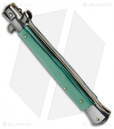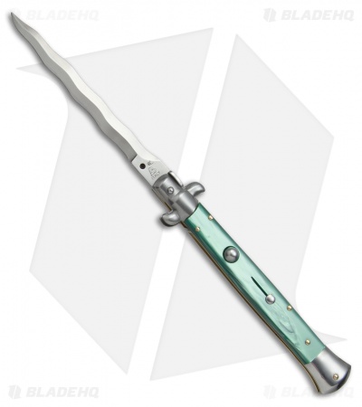 This 11″ Italian Stiletto from SKM Italy offers classic stiletto style with a green pearlex handle and a kriss style blade. SKM worked with famed knife-maker Armando Beltrame to bring you traditional stiletto designs at an affordable price. This 11″ model has a pearlex handle with stainless steel bolsters. Brass pins and liners add a classic finishing touch to the piece. The kriss style blade has a plain edge and a satin finish. Experience the affordable Italian quality of these authentic stilettos from SKM Italy.