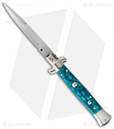 This 9″ Italian Stiletto from SKM Italy offers classic stiletto style with a turquoise acrylic handle and a satin finished bayonet blade. SKM makes a variety of Italian stilettos featuring traditional designs at an affordable price. This 9″ model has an acrylic handle with stainless steel bolsters. Brass pins add a classic finishing touch to the piece. The bayonet blade has a plain edge and a satin finish. Experience the affordable Italian quality of these authentic stilettos from SKM Italy.