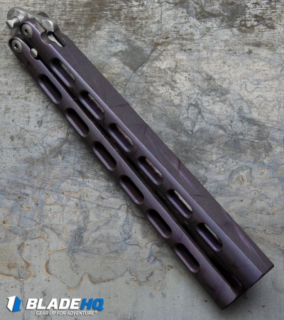 Mike Snody’s custom High Roller is a rather impressive balisong. It features milled channel-construction 6Al4V titanium handles and a flip-friendly latch-less design. This custom one-of-a-kind High Roller features candy pearl purple anodized handles. The blade is CPM-S35VN with stonewashed grinds and satin finished, stone textured flats. It comes new from maker and includes a certificate of authenticity, dated 8-12-16.