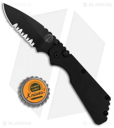 This Strider/Pro-tech PT auto is equipped with a black handle and a black finished blade with a partially serrated edge. The Pro-tech Strider collaboration revitalizes their popular SnG automatic model, with a compact EDC design. The Strider inspired profile remains the same, but the handle and blade have been scaled down to a more pocket friendly size. Black finished hardware and a deep carry pocket-clip round out the impressive EDC design.