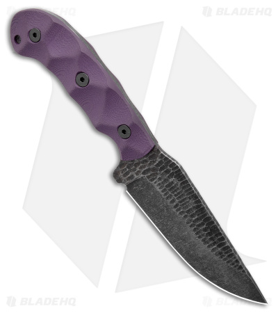 - Black stonewashed, hammer-finished drop point blade made from 1095 steel.