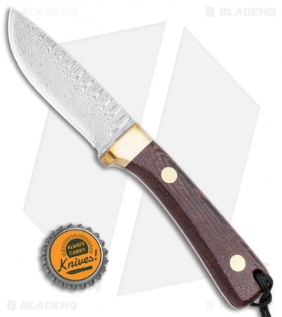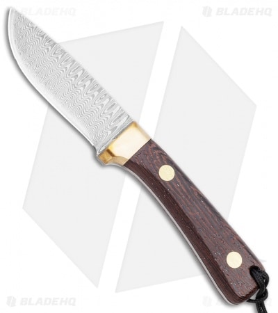 This Svord Damascus Drop Point 3 1/2″ fixed blade knife is from the Svord line of Deluxe Sporting Knives. It has a beautiful Damascus blade, a wood handle with brass pins and bolsters, and a leather sheath. This knife has a convex grind, so it is excellent for woods and hunting tasks.