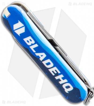 This Blade HQ Blade HQ Exclusive Victorinox Classic SD model has a blue handle with a wolf howling “Knives!” on one side and the Blade HQ logo on the other.