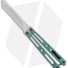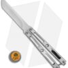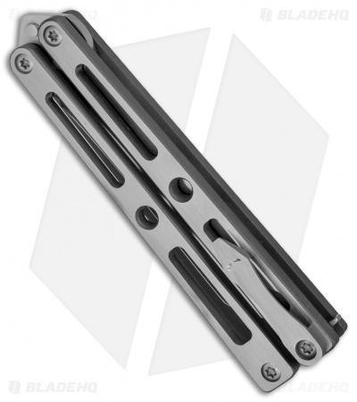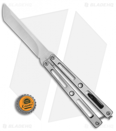This VMX Butterfly knife sports a “Tuxedo” finished titanium handle with satin faces and darkened edges. It has a satin finished, compound ground tanto blade.