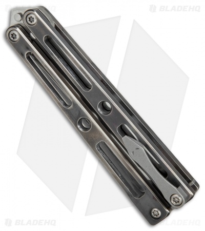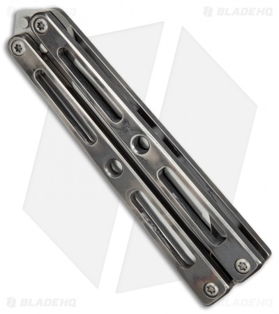 This VMX Butterfly knife sports a “Wasted” finished titanium handle and a satin finished tanto blade.