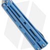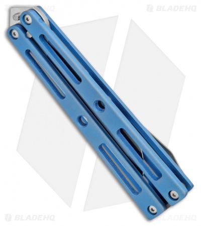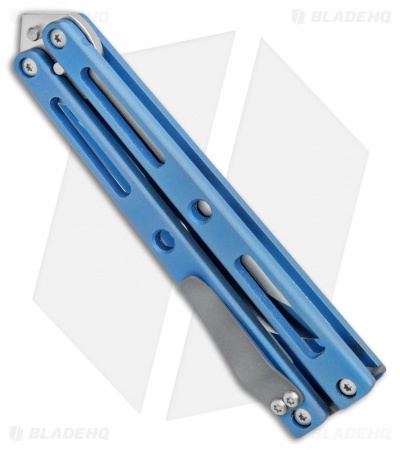 This VMX Butterfly knife sports a blue stonewashed titanium handle and a satin finished tanto blade.