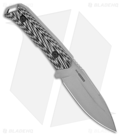 - Gray G-10 handle with a unique lightning bolt-like design.