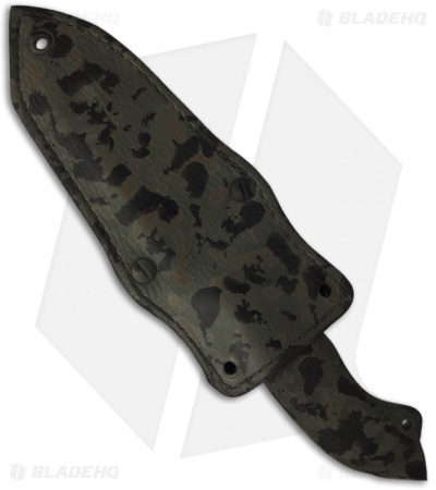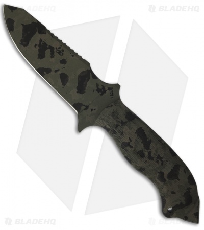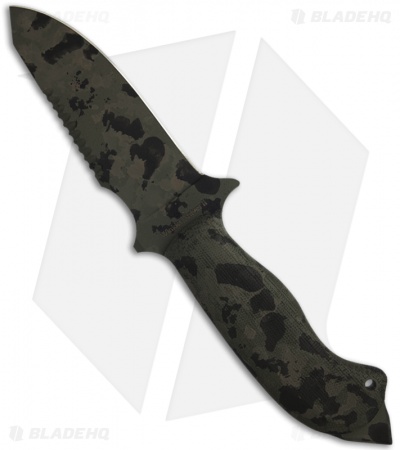 The S.A.R. Knife is a combination of the Utility and Spike knives. It was developed at the request of a municipal Search and Rescue Team. The blade is CPM-154 stainless steel with serrations along the spine to provide rope and fibrous cutting without giving up any of the primary cutting edge. The handle features Canvas Laminate scales, a cross guard and a glass breaker. This model has the Jungle Camo KG Gun Kote finish. Includes leather sheath.