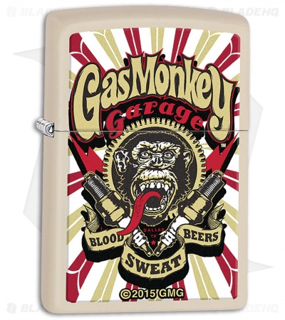 This Zippo model features a tan finish and a Gas Monkey graphic.